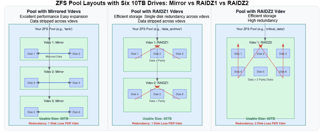 • La redondance des vdevs est locale : La redondance dans ZFS est locale à chaque vdev et non partagée à travers le pool. Assurez-vous de planifier la disposition de vos vdevs pour atteindre le niveau de résilience dont vous avez besoin.