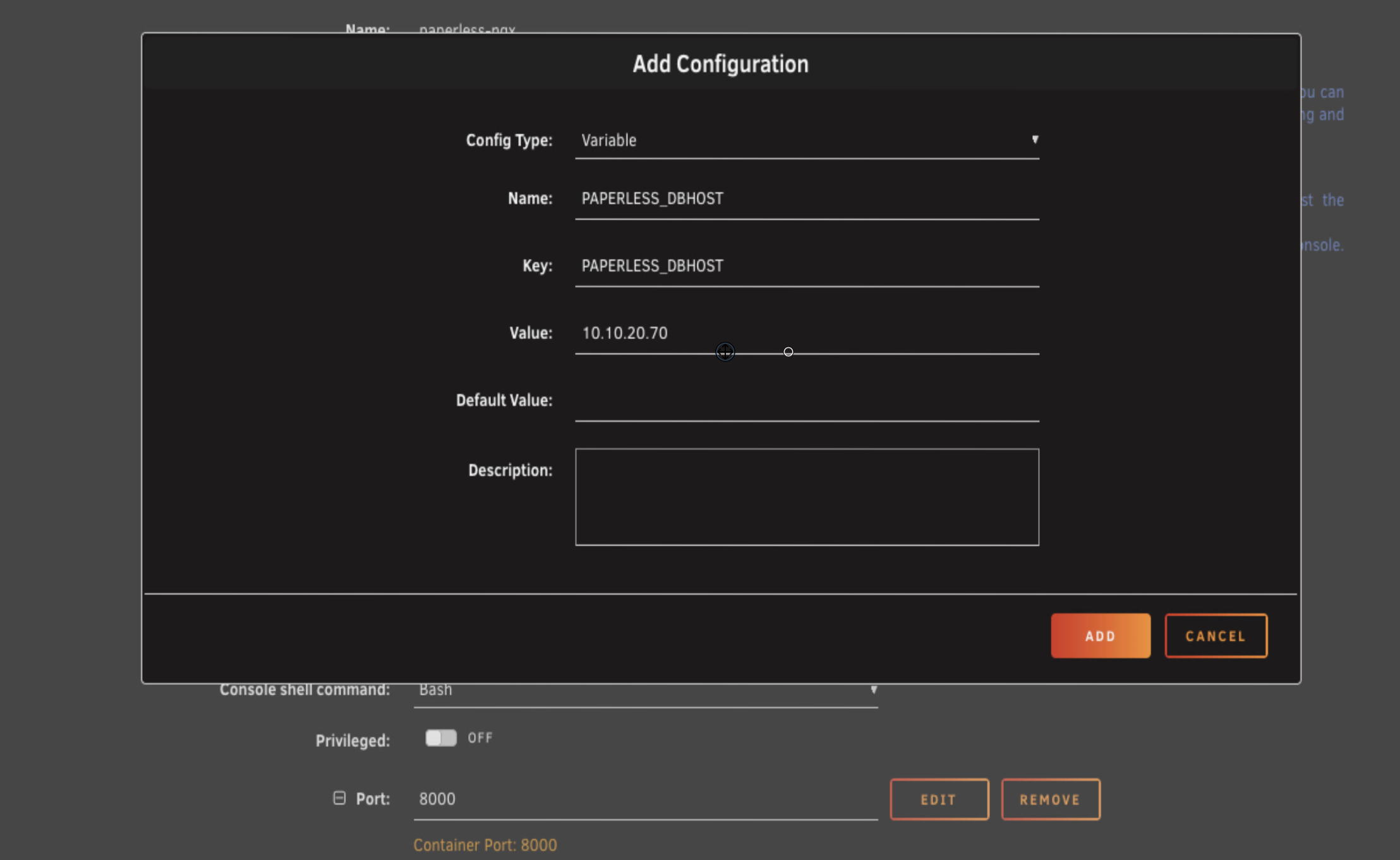 For the name, call it PAPERLESS_DBHOST. The key is the same. The value is the IP address of your Unraid server.