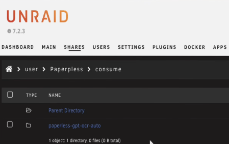 Go to your Unraid shares and open the Paperless share. Inside the consume folder, create a new subfolder and give it the same name as the OCR auto tag from the Paperless GPT template.