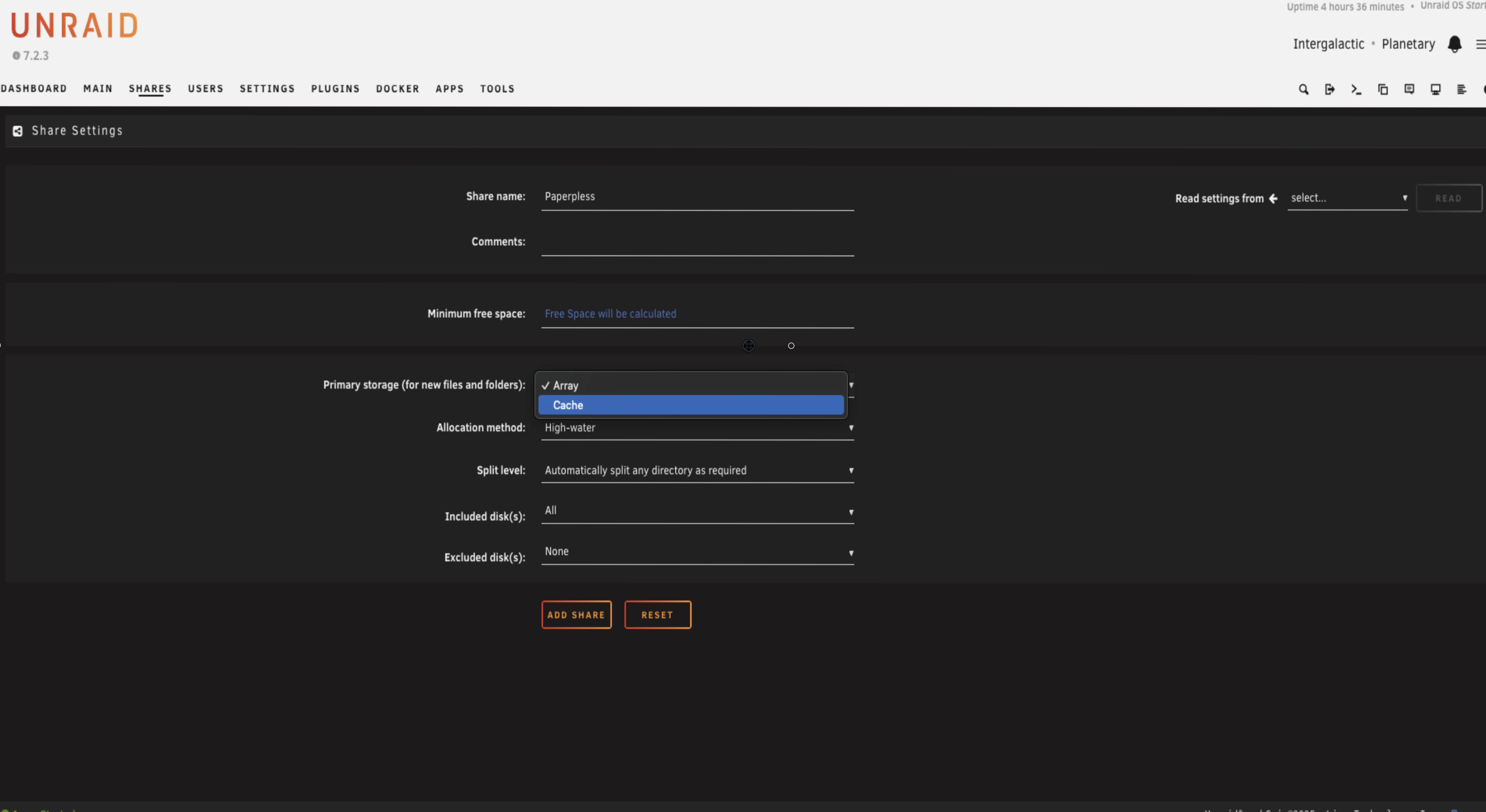 First thing we need to do is set up storage. Head to your shares and create a new one called paperless. I don't bother with cache on this share. I'm quite happy for it to go straight to the array. You could enable cache if you want, there's no real reason not to, but I don't think it's necessary for this workflow. The benefit is that files are immediately protected by parity the moment they land on the server, rather than sitting on the cache unprotected until the mover runs (unless you've got a mirrored cache pool, but a lot of us don't). And the performance difference for dropping a few documents into a network share is basically unnoticeable anyway.