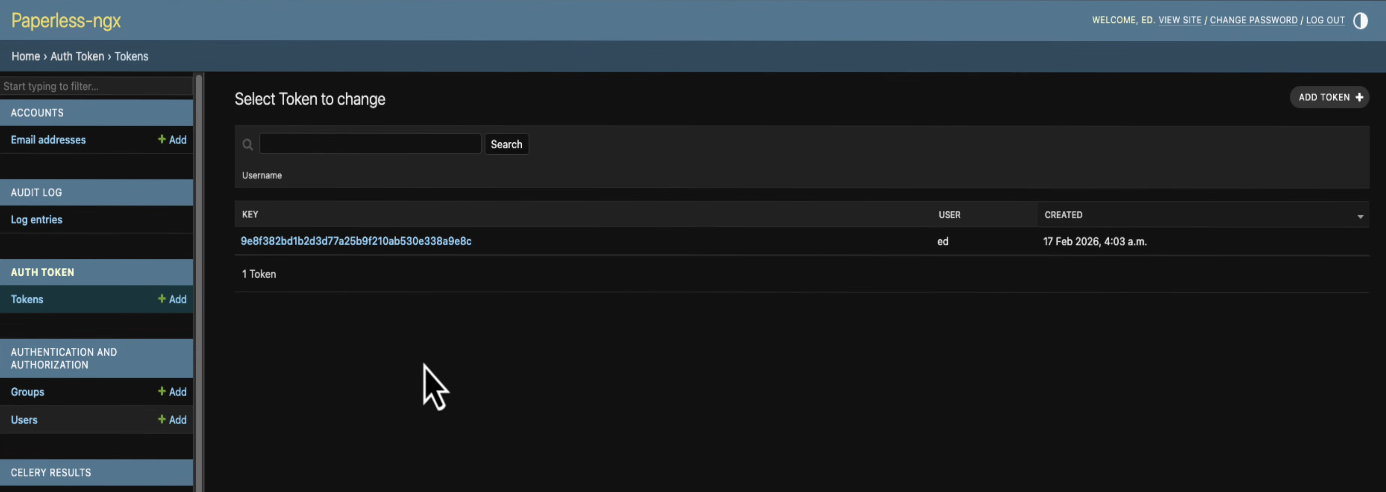 It needs an API token. Go over to the Paperless web interface, open Settings, and in the top right corner you'll see Open Django Admin.