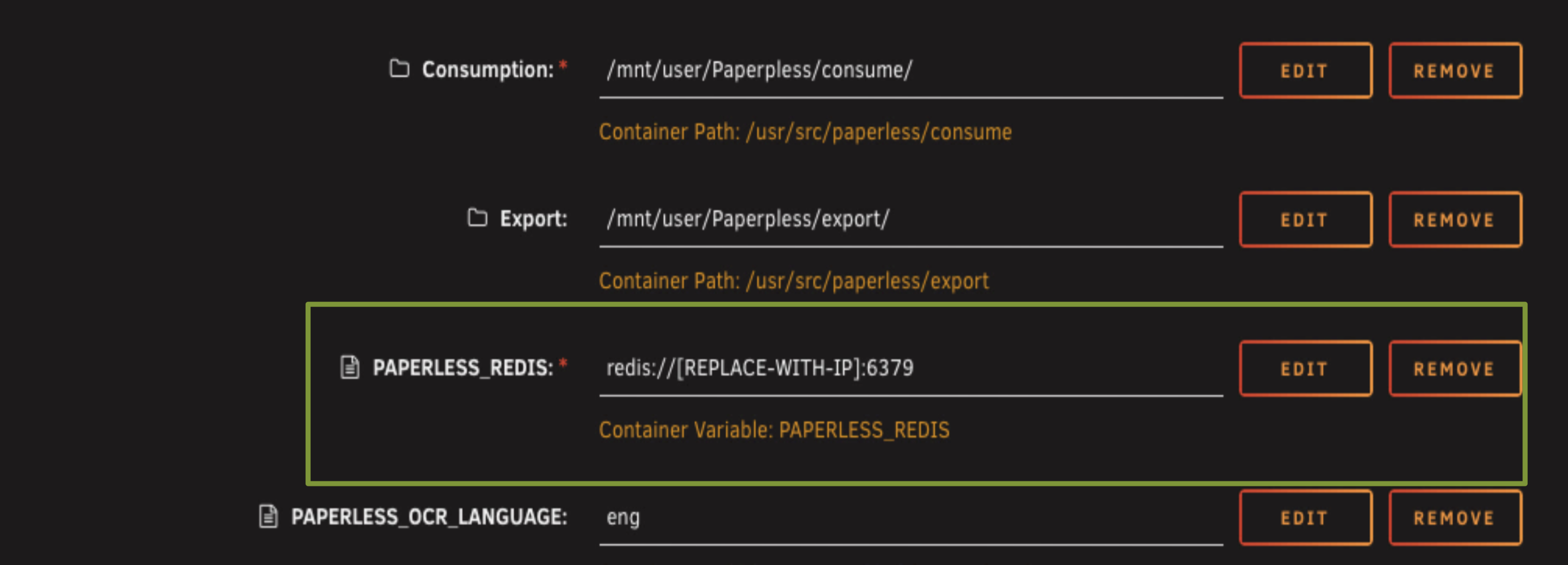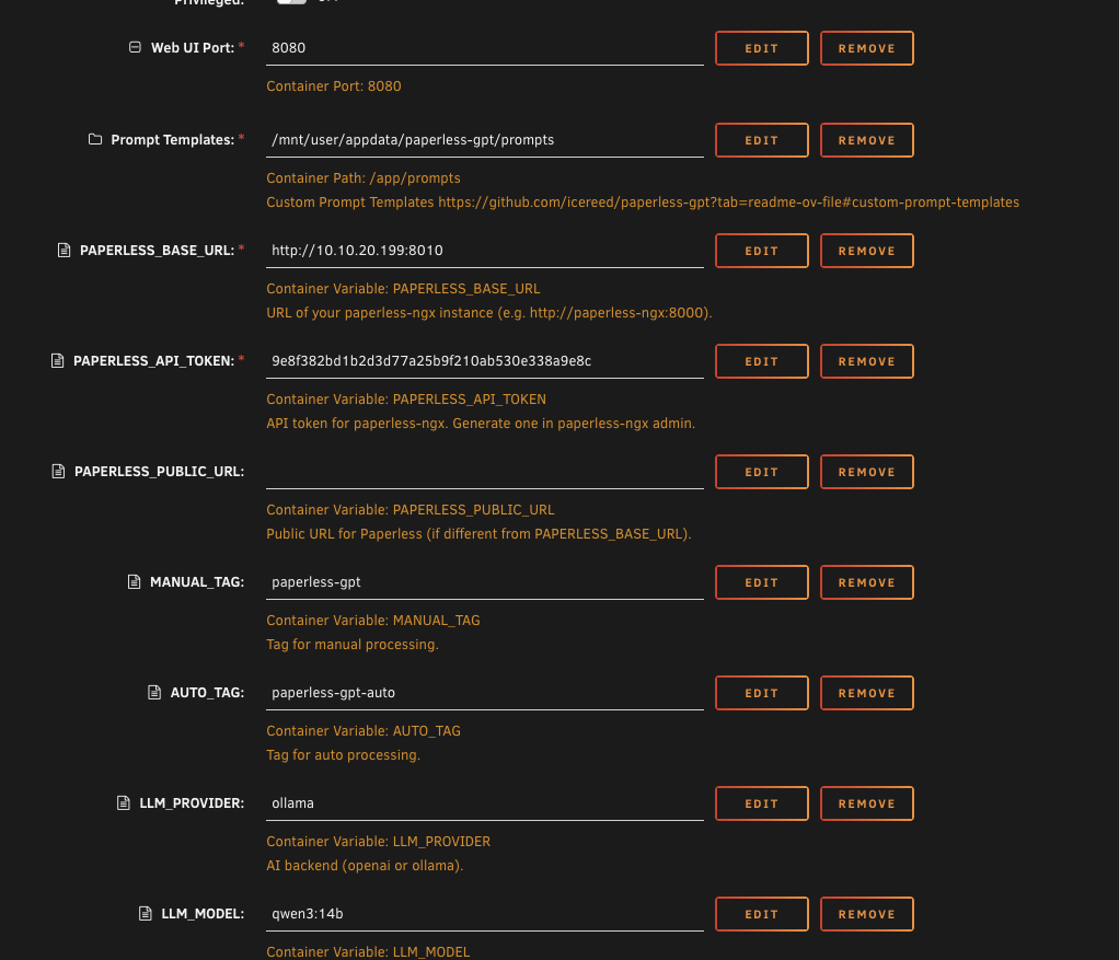 If you're planning to follow the rest of this guide, put these variables in now with your Unraid server's IP address. It'll save you coming back to edit the template later. If you're just setting up the basic Paperless system, you can skip these three entirely.