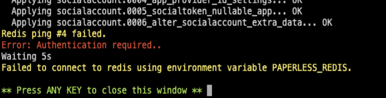 If everything is working properly, you'll see Paperless connecting to Redis and Postgres, and the worker processes starting up. If you see logs like this, everything's working.